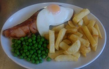 Served with chips and peas